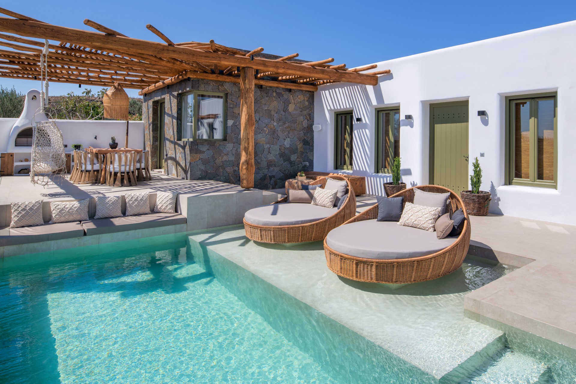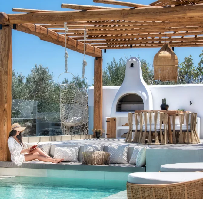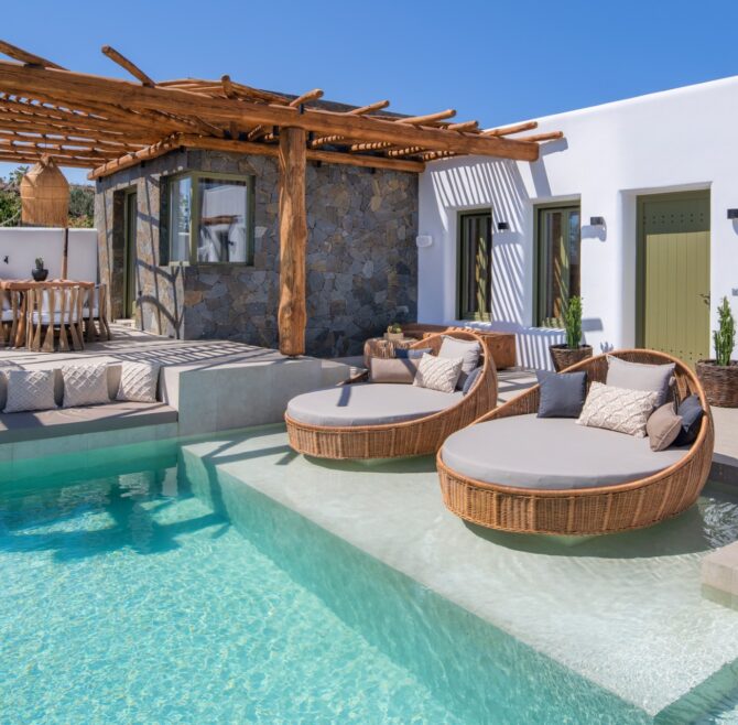 Welcome to the most exclusive accommodation proposal of Calm Collection Santorini. Ayama Hideaway Villa is a true holiday escape, a spot you can call your own and simply relax in utter luxury and indulgence. The Villa was designed as a lavish hideaway that praises the exuberant luxury of island living, while special attention was given to keeping the authenticity of Santorini’s elegant architecture and sophisticated style. Modern amenities and handmade wooden furniture merge seamlessly with traditional simplicity; the scenic beauty of the surroundings blend with the meticulous outdoors of Ayama Hideaway Villa with the private swimming pool, creating an irresistible allure of privacy and exclusivity. Here you will enjoy the real meaning of luxurious privacy! Let your senses run wild and free while gazing at the mesmerizing deep blue of the Aegean Sea. Revel in well-deserved moments of relaxation and tranquillity in the luxury of your elegant villa. Minimalism and Cycladic architecture prevail. Here, a well-kept secret for an extraordinary stay in Santorini awaits to reveal itself to you and your loved ones.